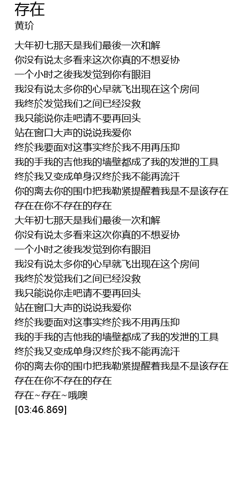 | [03:32.897] | cun zai zai ni bu cun zai de cun zai |