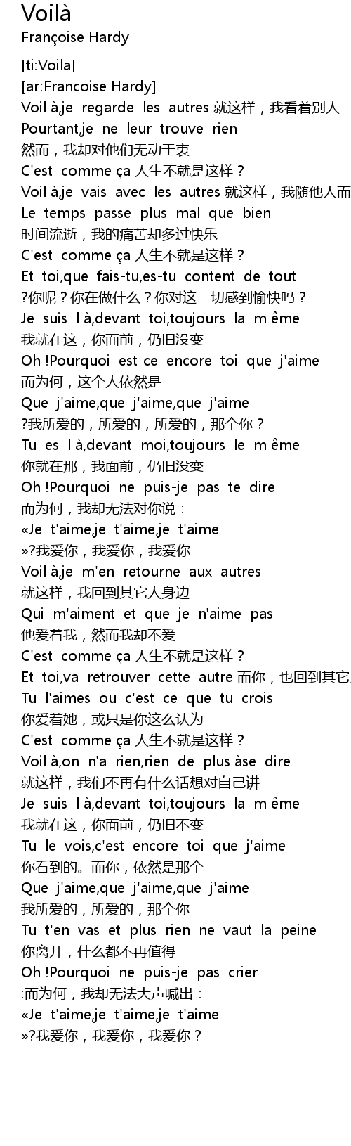 | [01:09.512] | Oh !Pourquoi est-ce encore toi que j'aime 而为何,这个人依然是 |