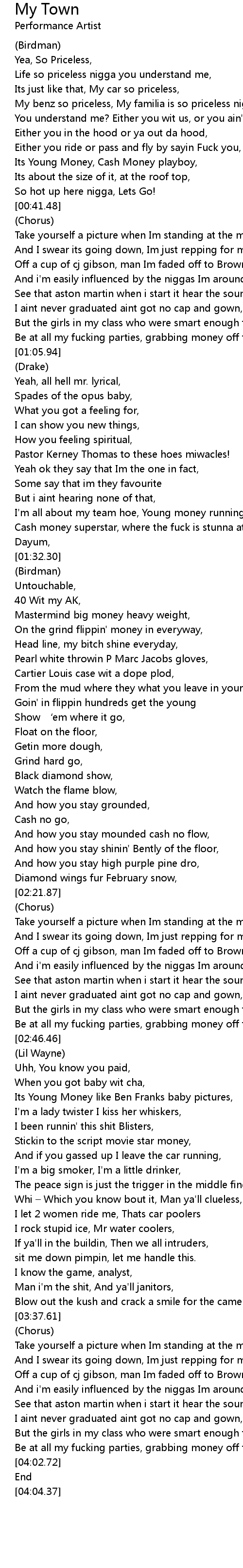 | [01:03.33] | Be at all my fucking parties, grabbing money off the ground, |