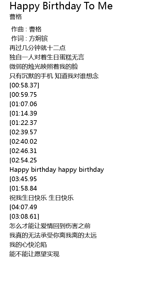 | [04:15.54][04:07.49][03:01.51] | 祝我生日快乐 |
