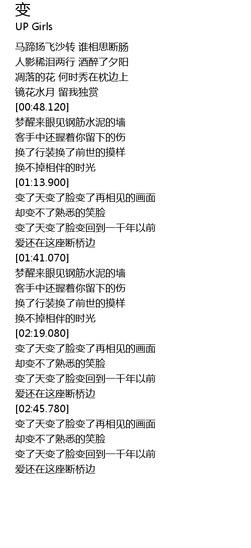 | [02:48.230] | biàn le tiān biàn le liǎn biàn le zài xiāng jiàn de huà miàn |