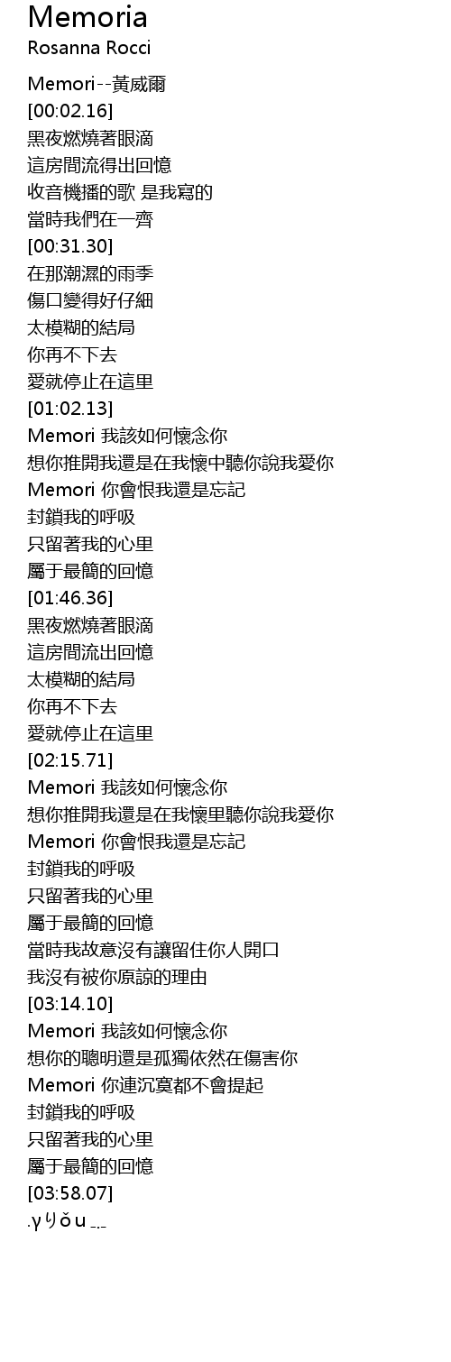 | [02:31.52] | Memori nǐ huì hèn wǒ hái shì wàng jì |