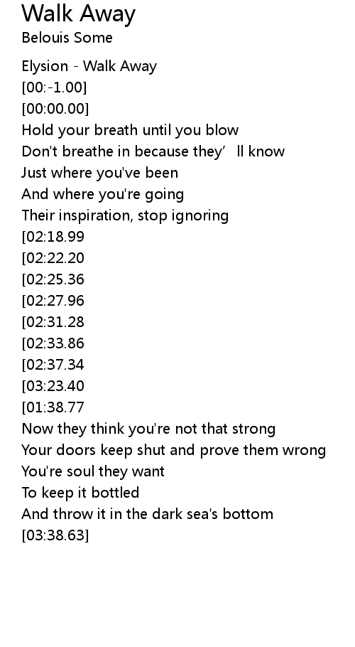 | [03:26.38][03:23.40][03:20.24][02:41.04][01:35.72] | Just walk away |