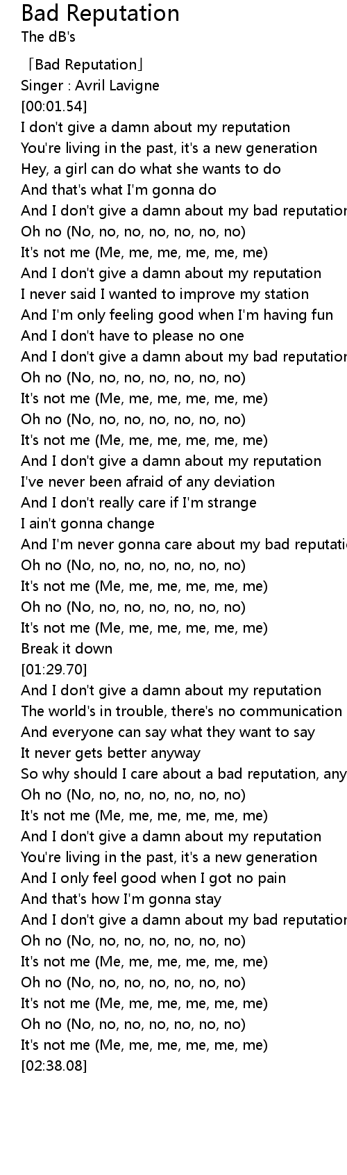 | [01:14.62] | And I' m never gonna care about my bad reputation |