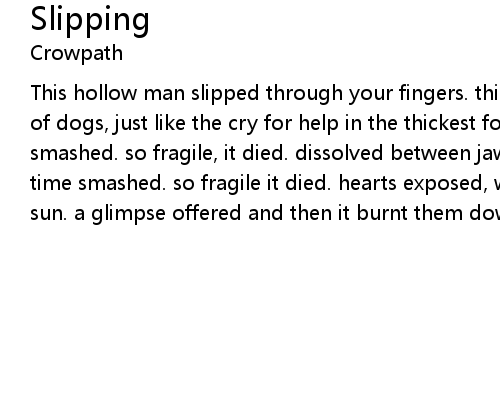 | This hollow man slipped through your fingers. this life dissolved between jaws of dogs, just like the cry for help in the thickest fog. time hit concrete, time smashed. so fragile, it died. dissolved between jaws of dogs. time hit concrete, time smashed. so fragile it died. hearts exposed, with the promise to see the sun. a glimpse offered and then it burnt them down. |