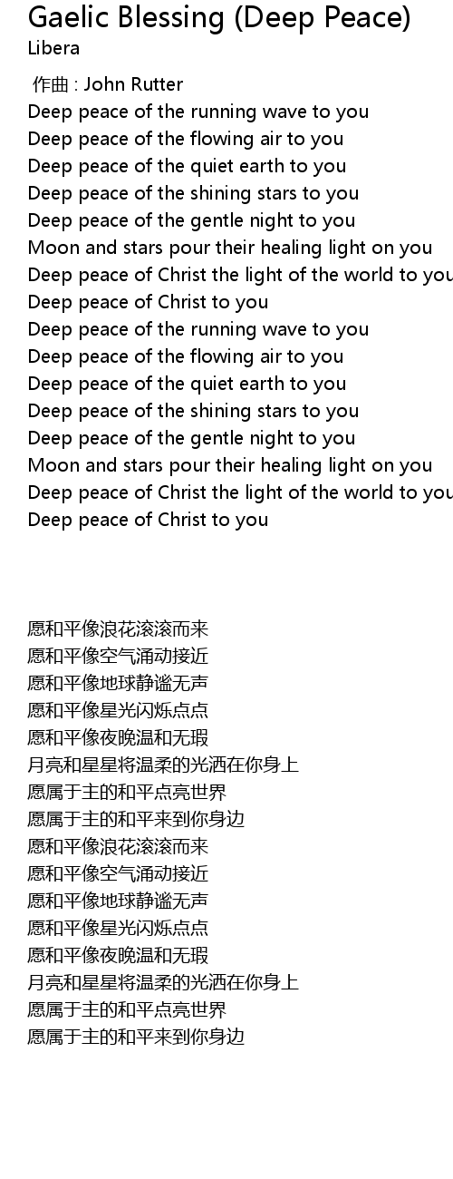 | [01:03.70] | Deep peace of Christ the light of the world to you |
