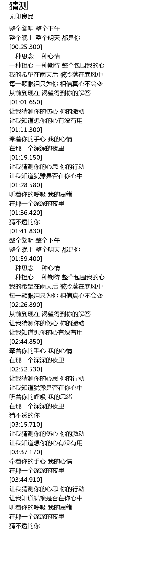 | [02:53.660] | ràng wǒ cāi cè nǐ de xīn sī nǐ de xíng dòng |