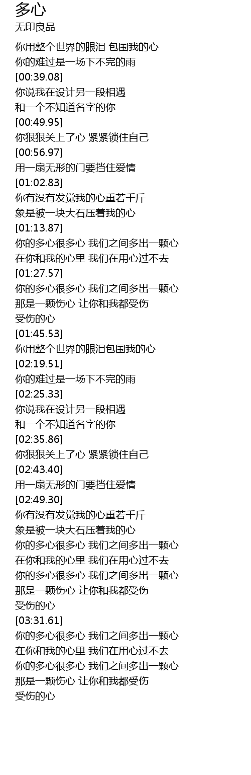 | [03:47.11] | nǐ de duō xīn hěn duō xīn wǒ men zhī jiān duō chū yī kē xīn |