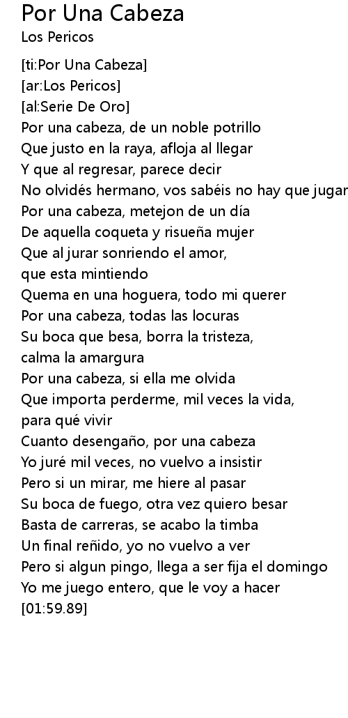 | [00:44.42] | Por una cabeza, metejon de un dí a |
