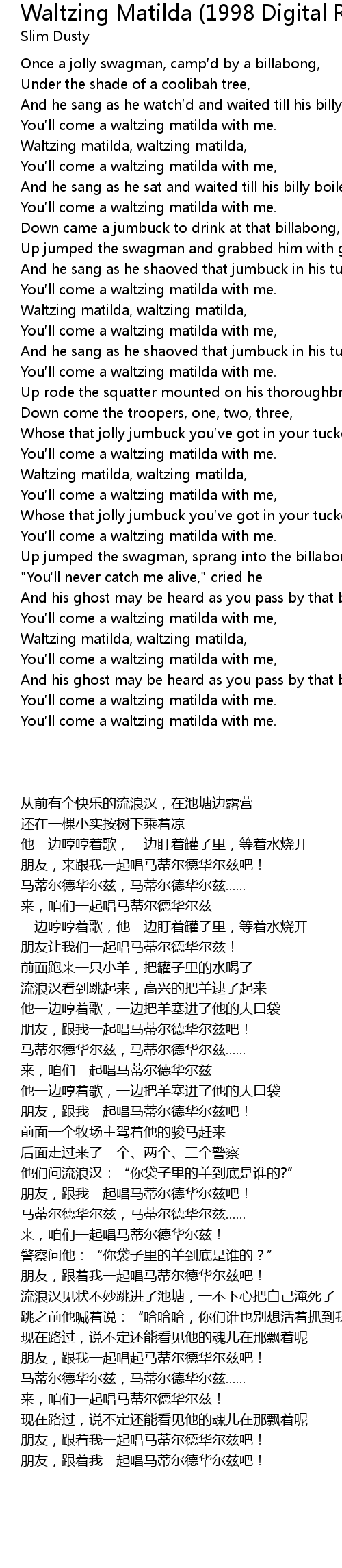 | [02:11.49] | You ll come a waltzing matilda with me. |
