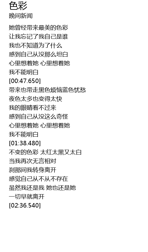 | [02:09.010] | bu bian de se cai tai hong tai hei you tai bai |