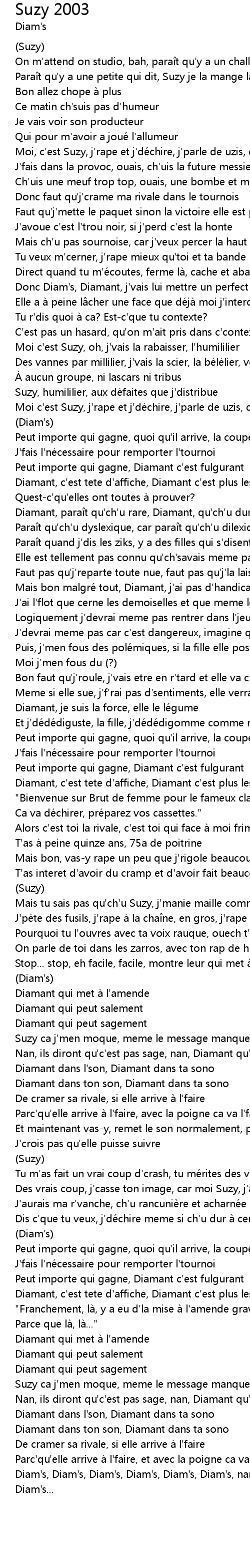 | Moi c' est Suzy, j' rape et j' de chire, j' parle de uzis, de rap et d' de sir | |