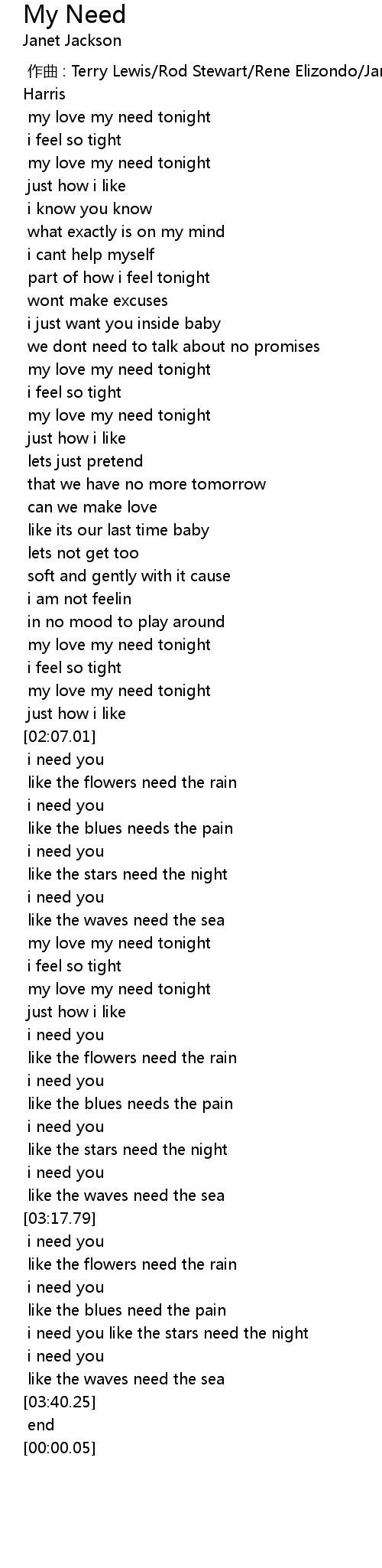 | [00:00.00] | zuo qu : Terry Lewis Rod Stewart Rene Elizondo Janet Jackson James Harris |