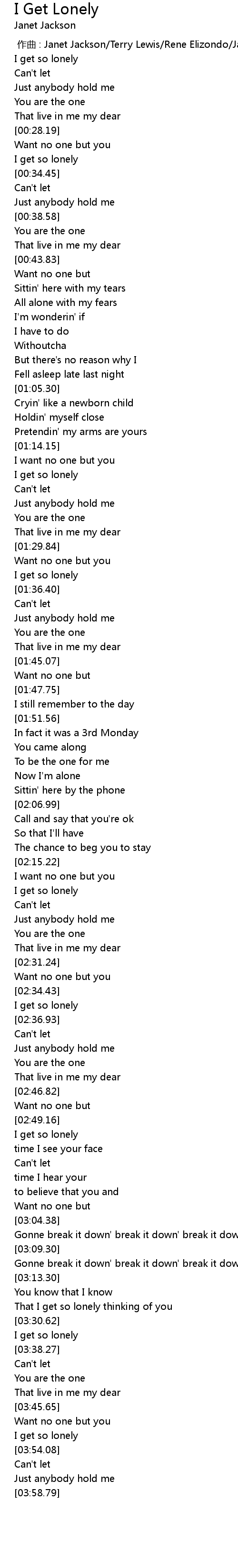 | [00:00.00] | 作曲 : Janet Jackson/Terry Lewis/Rene Elizondo/James Harris |