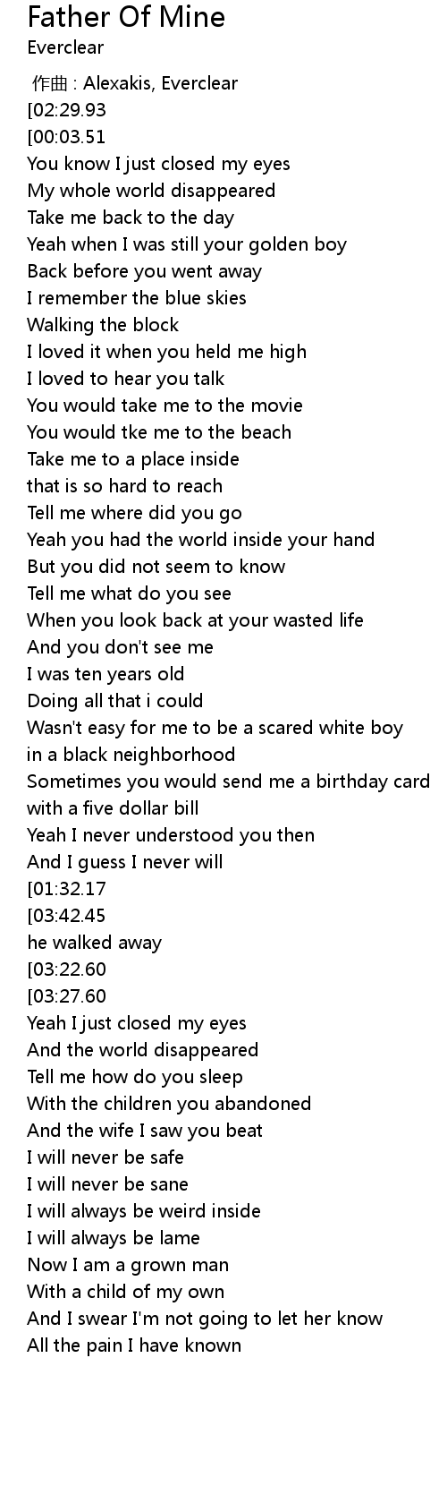 | [02:40.61][02:29.93][01:00.87][00:49.66][00:11.19][00:00.95] | Father of mine |