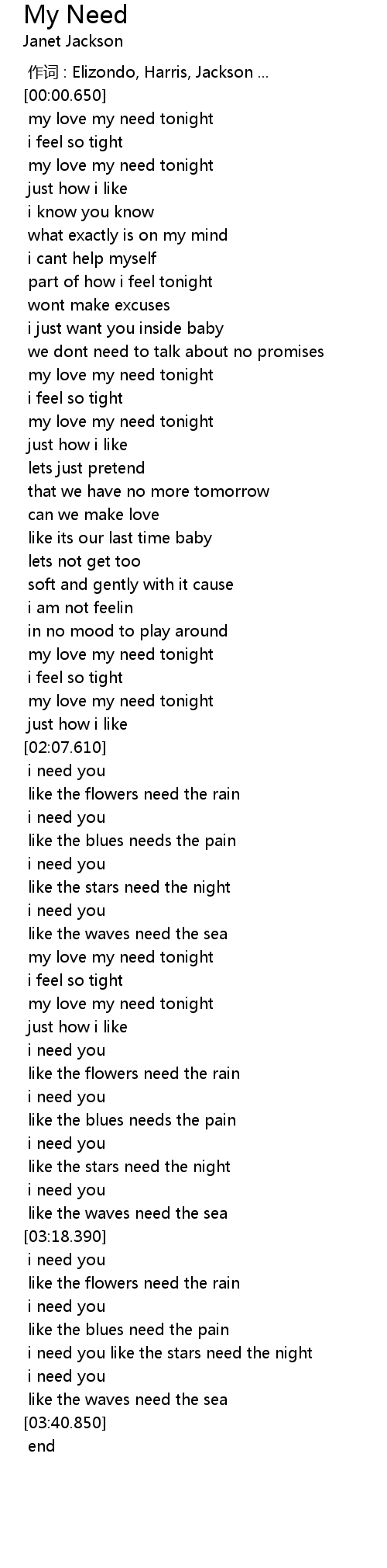 | [00:30.990] | my love my need tonight |