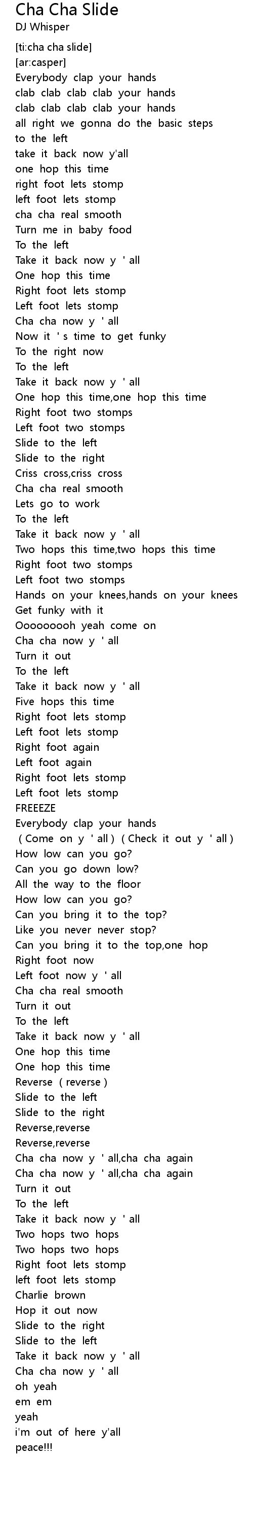 | [02:53.690] | Cha cha now y 'all,cha cha again |