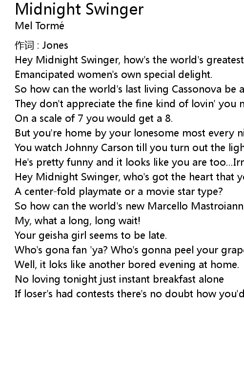 | Hey Midnight Swinger, who' s got the heart that you' re breaking tonight? | |