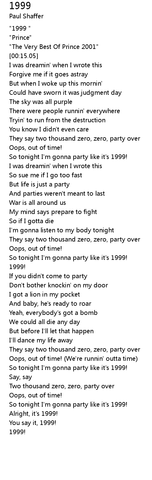 [01:13.44] So tonight I'm gonna party like it's 1999!