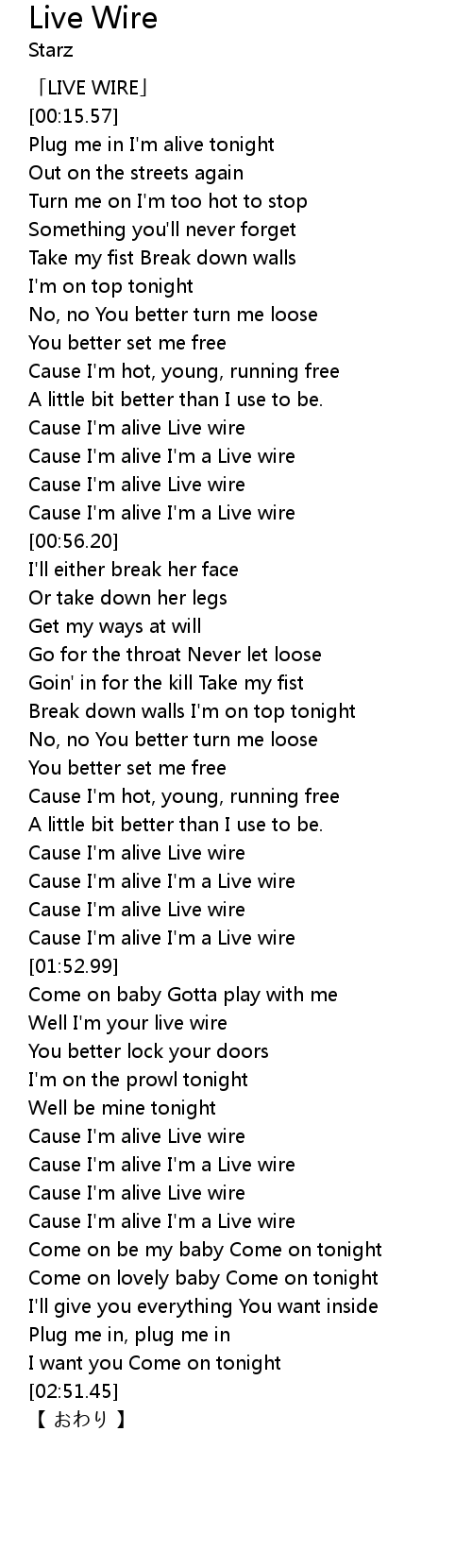| [00:43.02] | Cause I' m alive I' m a Live wire |