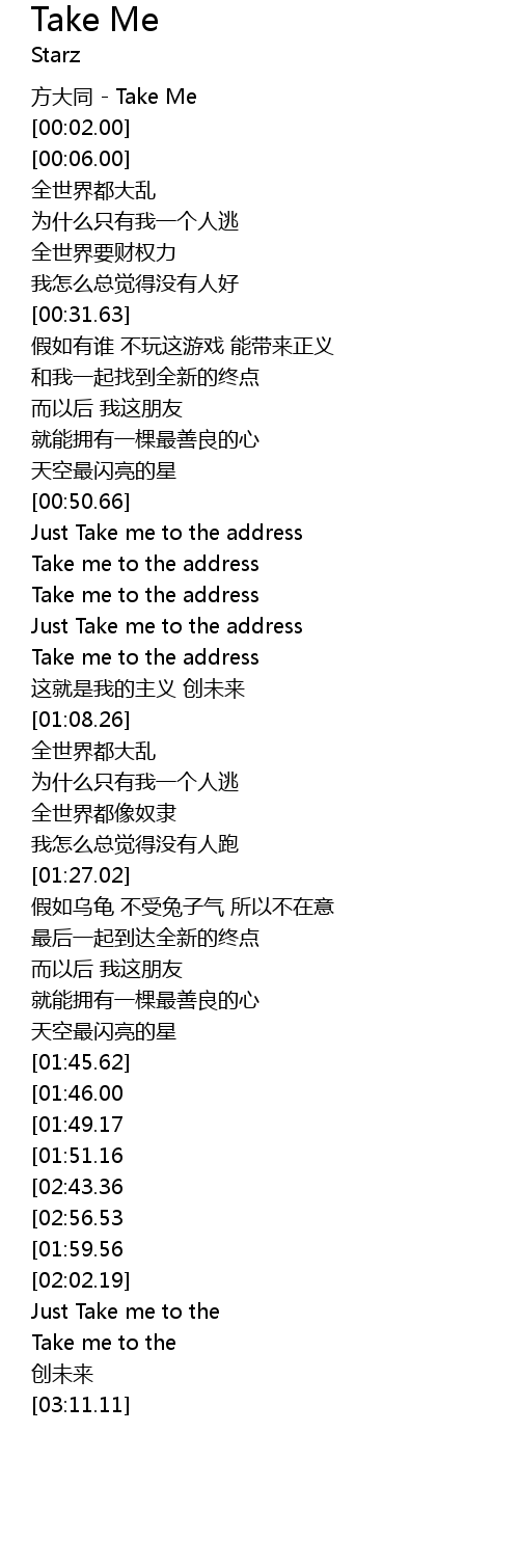 | [02:57.98][02:56.53][02:48.79][02:46.47][01:57.48] | Take me to the address |