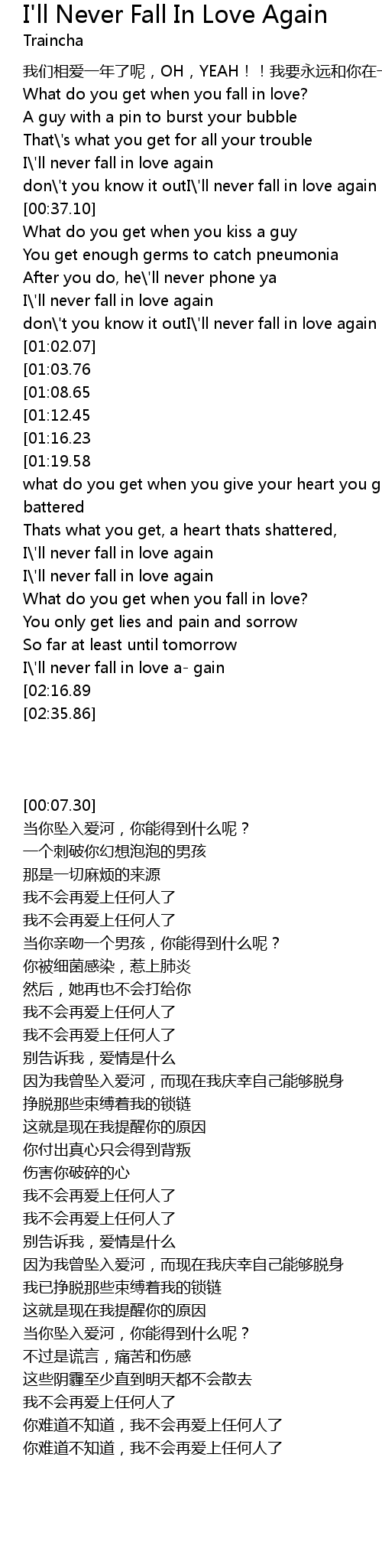 | [00:32.60] | don\'t you know it outI\'ll never fall in love again |