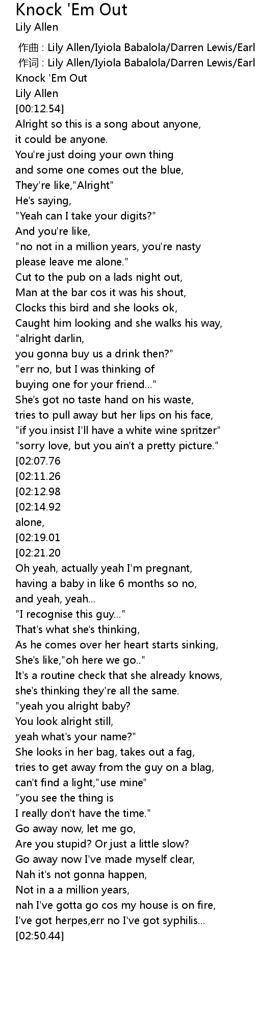 | [00:00.00] | 作曲 : Lily Allen/Iyiola Babalola/Darren Lewis/Earl King |
