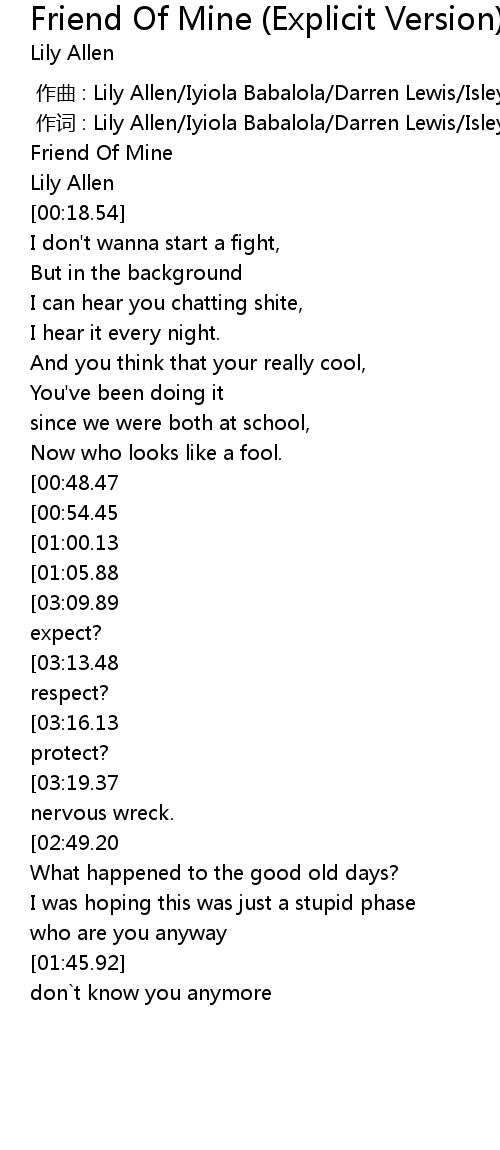 | [01:59.69][00:48.47] | You' re no friend of mine girl |