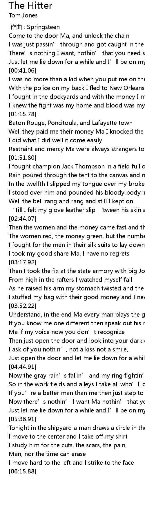 | [04:46.43] | Now the gray rain’s fallin’ and my ring fightin’s done |