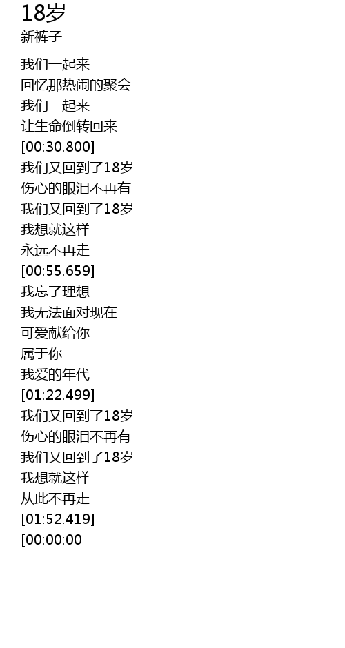 | [02:03.299][00:00:00] | xīn kù zi yuè duì 18 suì |