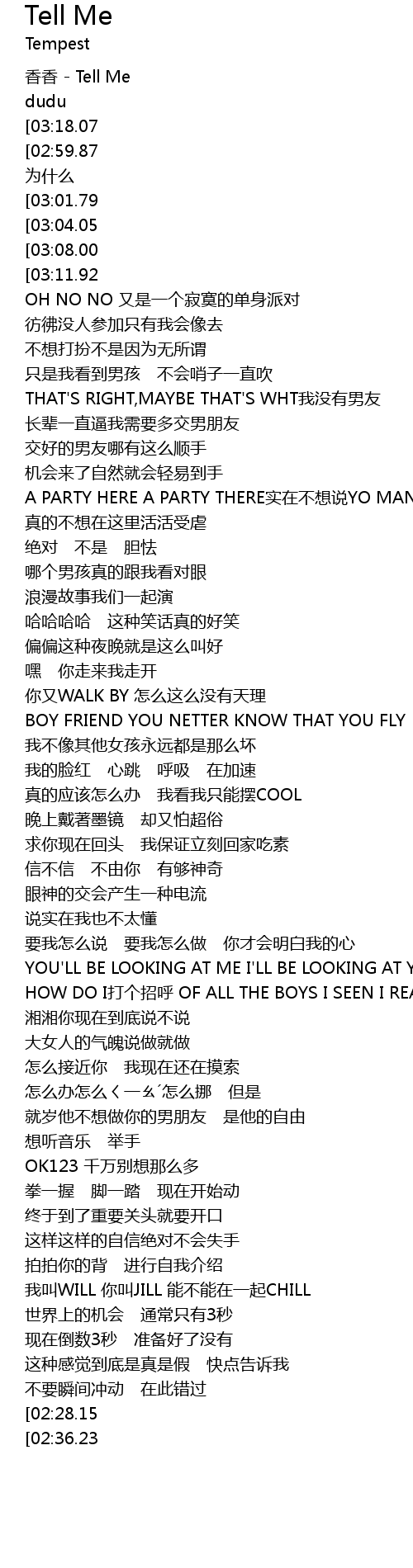 | [03:32.22][02:59.87][02:43.19][01:39.45][00:51.78][00:03.43] | JUST TELL ME wei shi me |