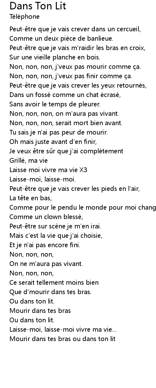 | Mourir dans tes bras ou dans ton lit |
