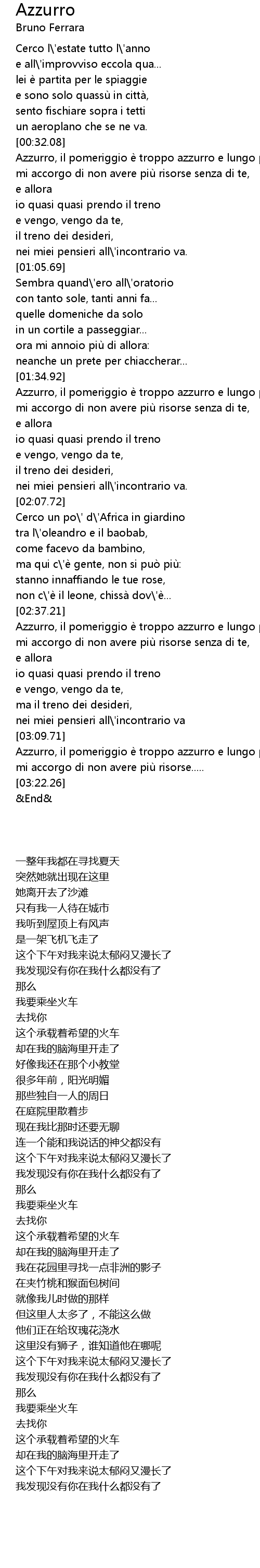| [00:32.42] | Azzurro, il pomeriggio e troppo azzurro e lungo per me, |