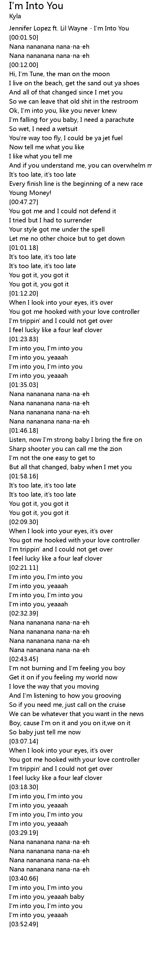 | [00:00.00] | Jennifer Lopez ft. Lil Wayne - I'm Into You |