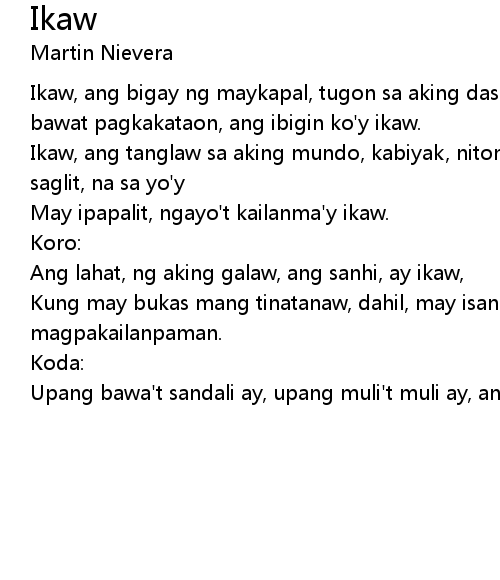 | Ikaw, ang bigay ng maykapal, tugon sa aking dasal, upang sa lahat ng panahon, bawat pagkakataon, ang ibigin ko'y ikaw. | |