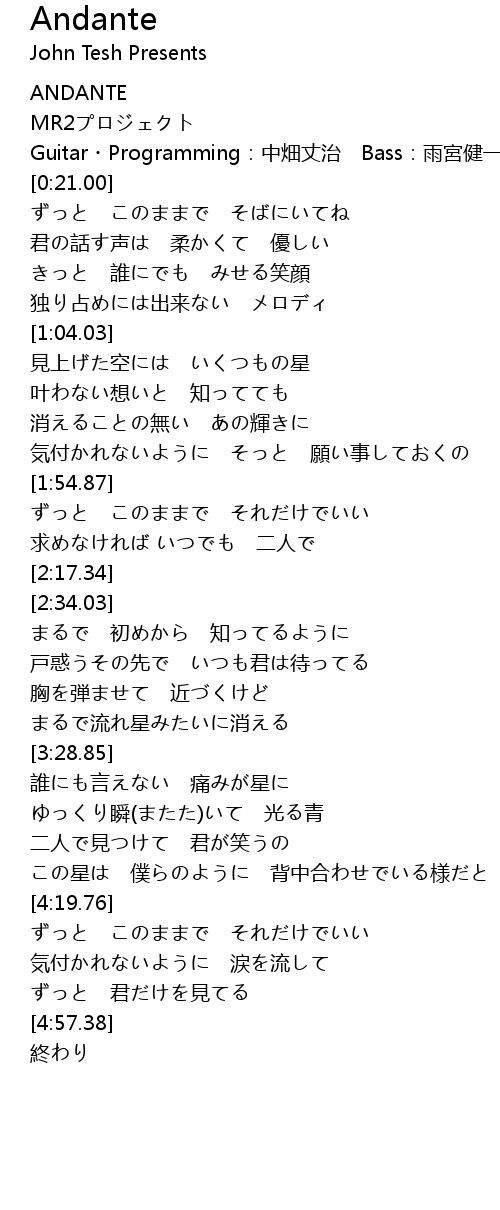 | [0:34.35] | 君の話す声は 柔かくて 優しい |