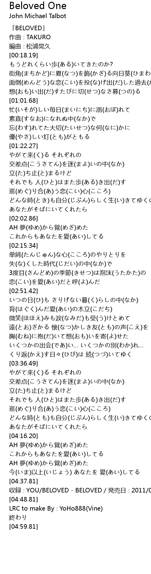 | [04:43.81] | 収録∶YOU/BELOVED - BELOVED/発売日∶2011/08/31 |