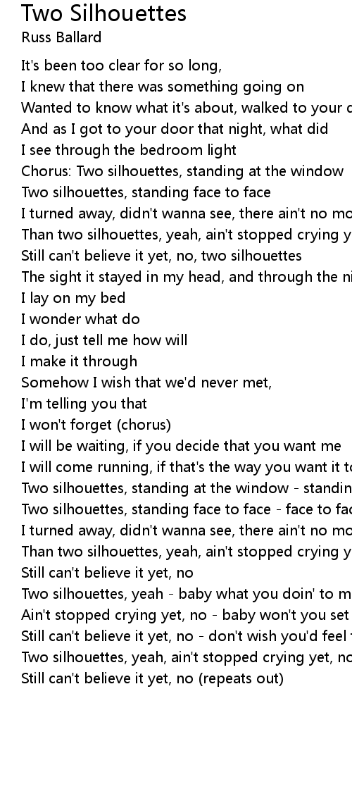 Two silhouettes, yeah, ain't stopped crying yet, no