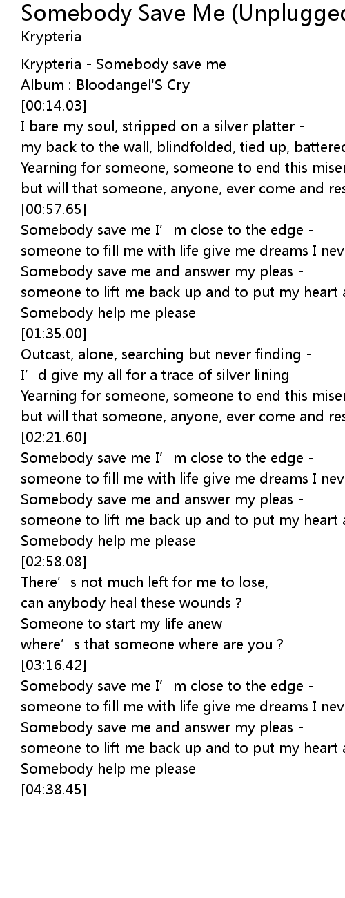 | [04:18.01] | Somebody save me and answer my pleas - |