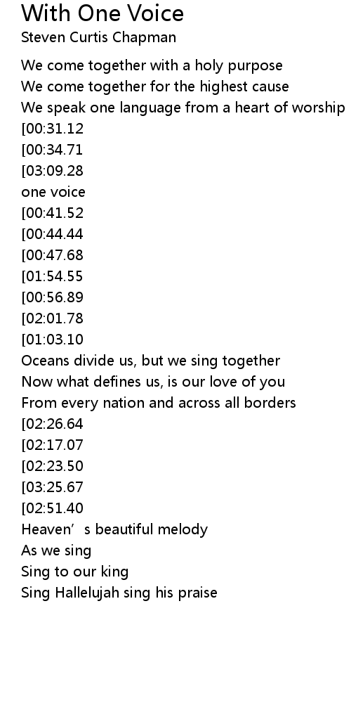 | [03:15.53][03:09.28][02:50.99][02:07.13][01:51.67][01:39.06][01:06.65][00:50.86][00:38.12] | With one voice |