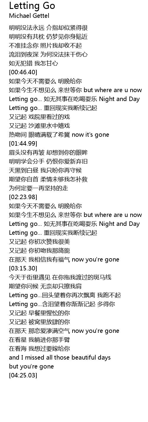 | [03:40.10] | Letting go... hán lèi wàng zhe nǐ jiàn jiàn jì qǐ duō de nǐ |