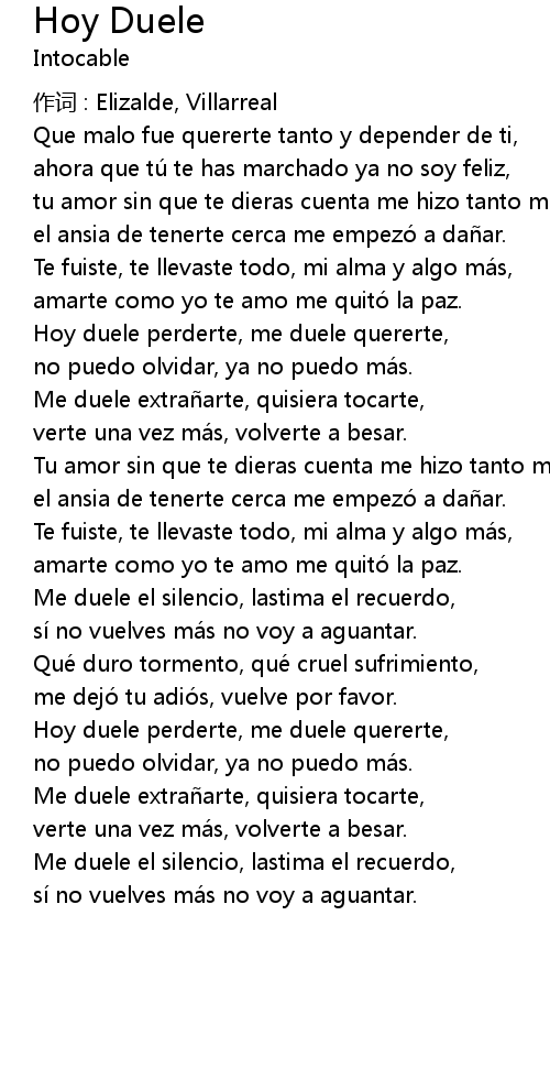 | Hoy duele perderte, me duele quererte, | |