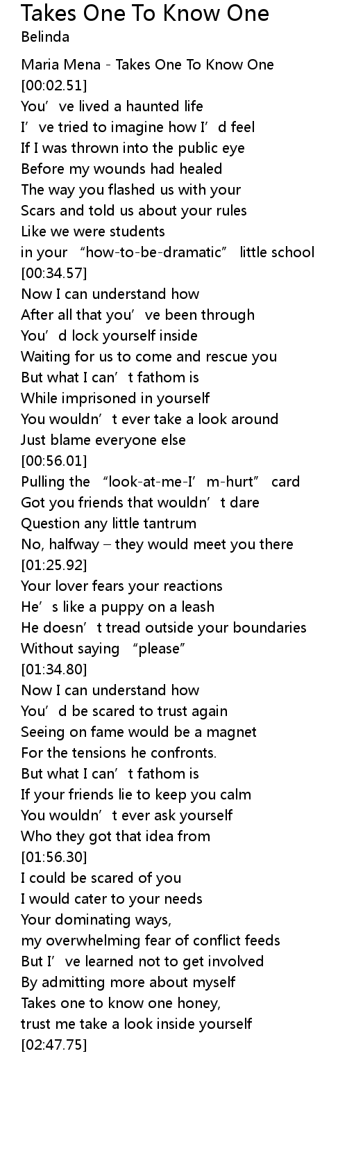 | [00:00.00] | Maria Mena - Takes One To Know One |