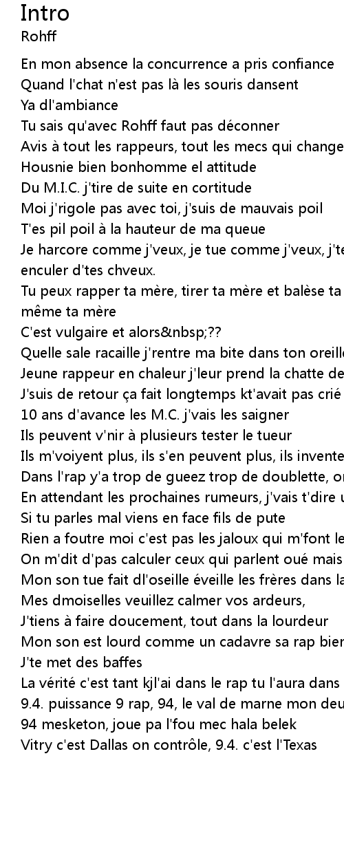 | Je harcore comme j'veux, je tue comme j'veux, j'termine mes rimes comme j'veux enculer d'tes chveux. | |