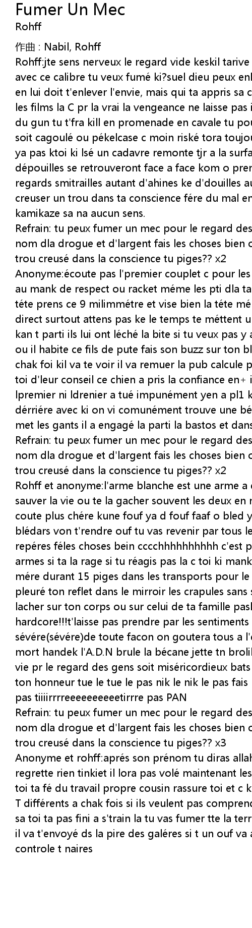 | Rohff et anonyme: l' arme blanche est une arme a double tranchant elle peux te sauver la vie ou te la gacher souvent les deux en me me temps une cavale sa coute plus che re kune fouf ya d fouf faaf o bled ya pas d' flooze et les ble dars von t' rendre ouf tu vas revenir par tous les chemins me nent a ces repe res fe les choses bein cccchhhhhhhhhh c' est pe pe re jpe t' fournir les armes si ta la rage si tu re agis pas la c toi ki manke de courage tu vois ta me re durant 15 piges dans les transports pour le parloir ou celui de ton ennemi pleure ton reflet dans le mirroir les crapules sans scrupules voudraient se lacher sur ton corps ou sur celui de ta famille paske la rue c' est hardcore!!! t' laisse pas prendre par les sentiments faut e tre se ve re se ve re de toute facon on goutera tous a l' enfer rassure toi de sa mort handek l' A. D. N brule la be cane jette tn brolik dans la seine nik pas ta vie pr le regard des gens soit mise ricordieux bats les couilles des gens pour ton honneur tue le tue le pas nik le nik le pas fais le fais le pas tire tire pas tiiiirrrreeeeeeeeeetirrre pas PAN | |