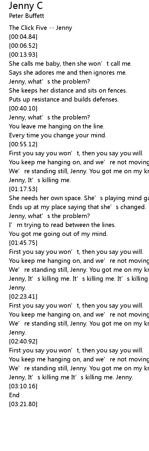 | [02:57.08] | Jenny, It' s killing me It' s killing me. Jenny. |