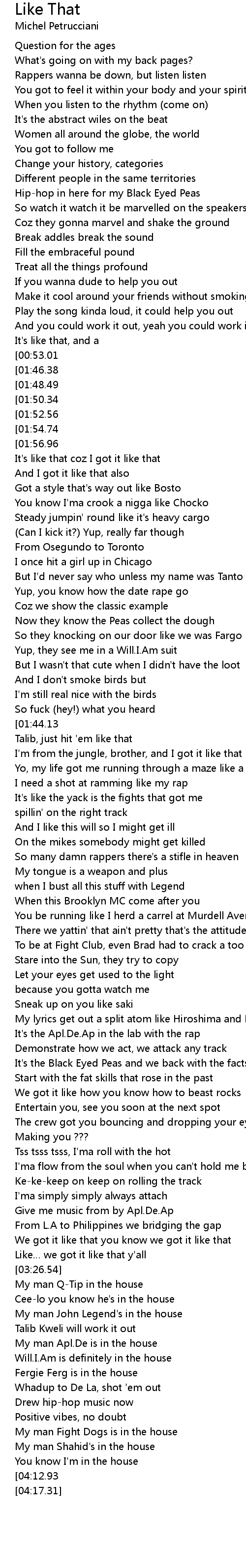 | [03:13.79][01:48.49][00:56.80] | Y'all we got it like that (like that) |