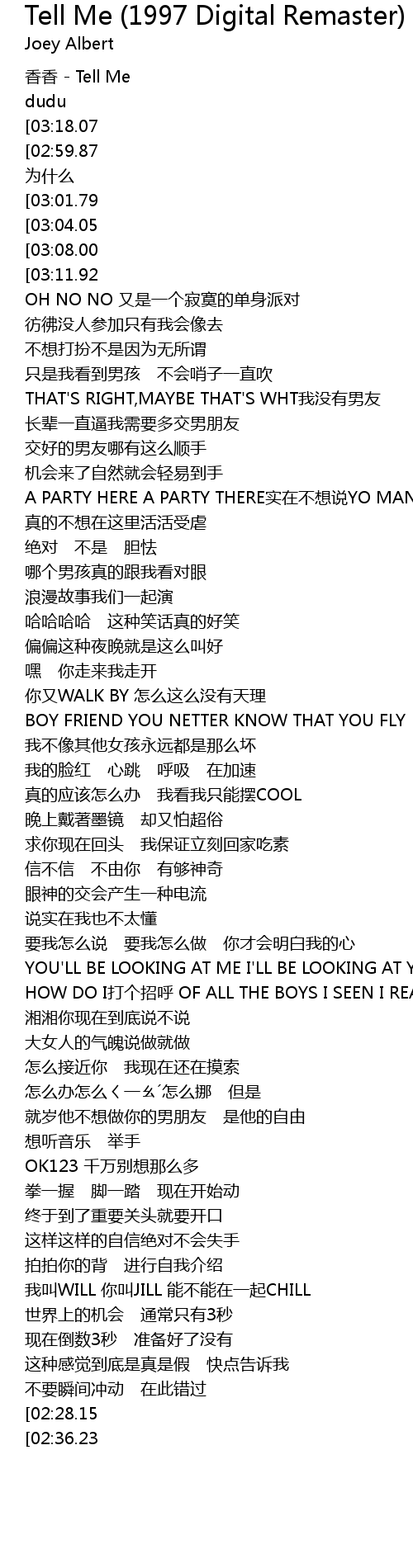 | [03:32.22][02:59.87][02:43.19][01:39.45][00:51.78][00:03.43] | JUST TELL ME wei shi me |