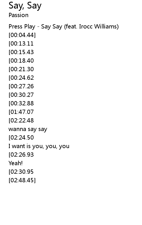 | [00:01.12] | Press Play - Say Say (feat. Irocc Williams) |