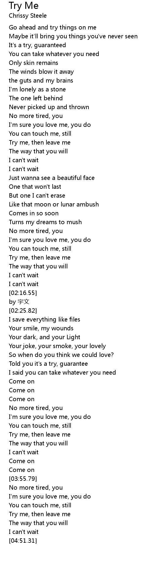| [01:59.52] | Try me, then leave me |